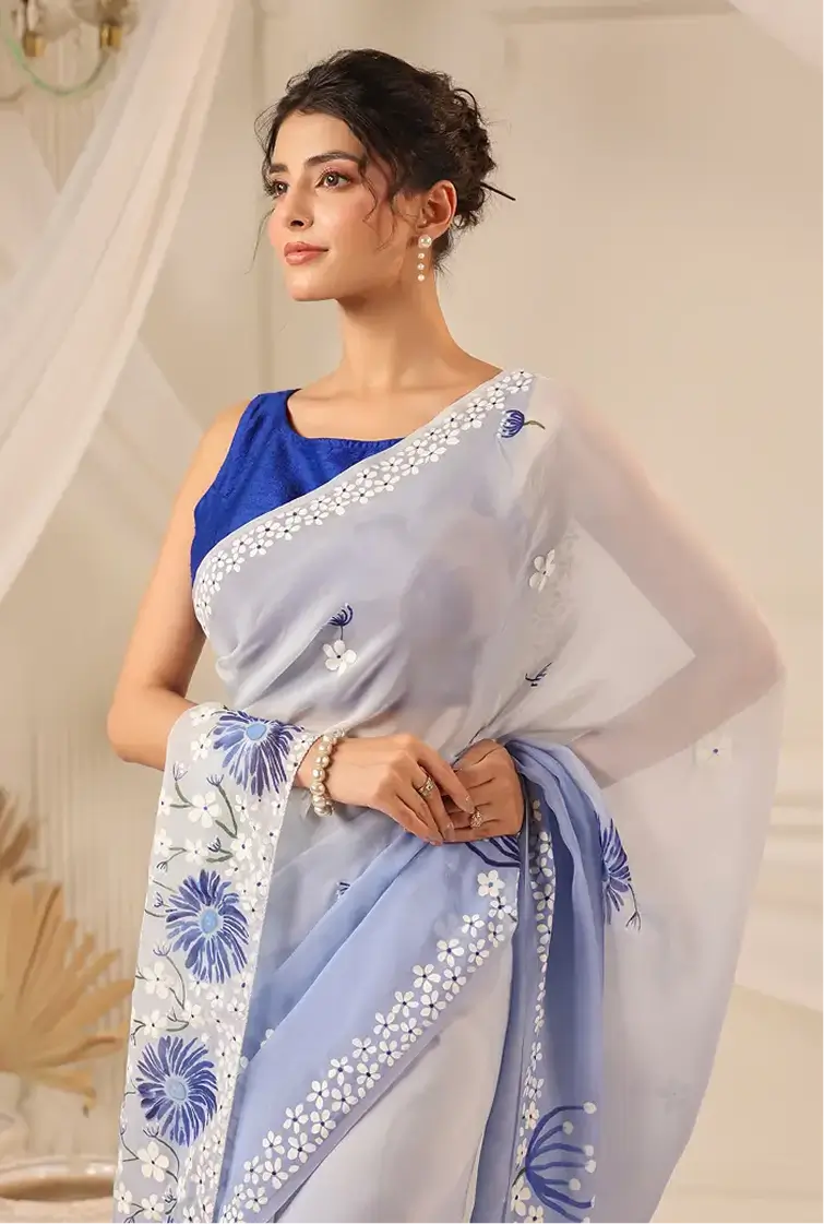 Hand-painted florals and architectural details on crepe, georgette, chinon, and chanderi – modern heirloom sarees.